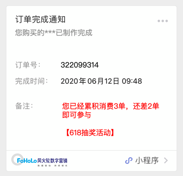 当粉丝通过小程序或APP提交订单时,品牌就可向粉丝发送完成订单的模板消息,在备注中提醒粉丝“您已经累积消费3单,还差2单即可参与618抽奖活动”,并插入跳转小程序页面的链接。如果消费者未关注品牌的服务号,还可通过短信通知他。