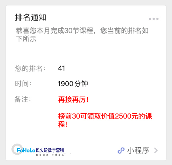 品牌也可设置排名激励类活动,鼓励粉丝参与活动/消费。如下图所示,该网课品牌每周/每月会定时向学员发送排名通知的模板消息,如果模板消息触达不到时,可通过网课学习APP进行排名信息的推送。