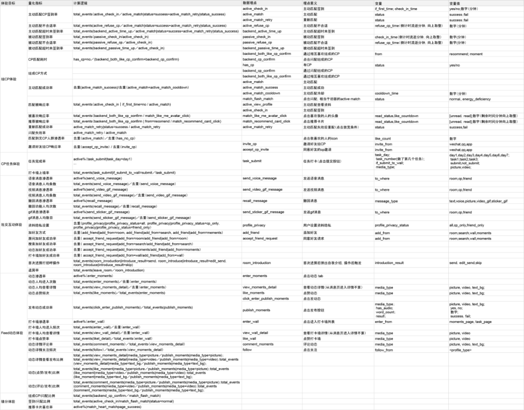 根据埋点意义确定需要埋哪些点以及指标与埋点之间的计算逻辑,最后整理如图所示: