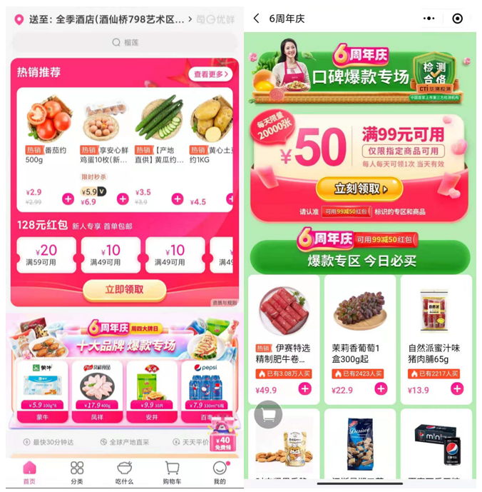 作为一家已经经营了6年多的老牌生鲜电商,每日优鲜除了线下有大量的前置仓和门店布局之外,线上的一些常规渠道基本也都有,也是活动引流的重要入口。