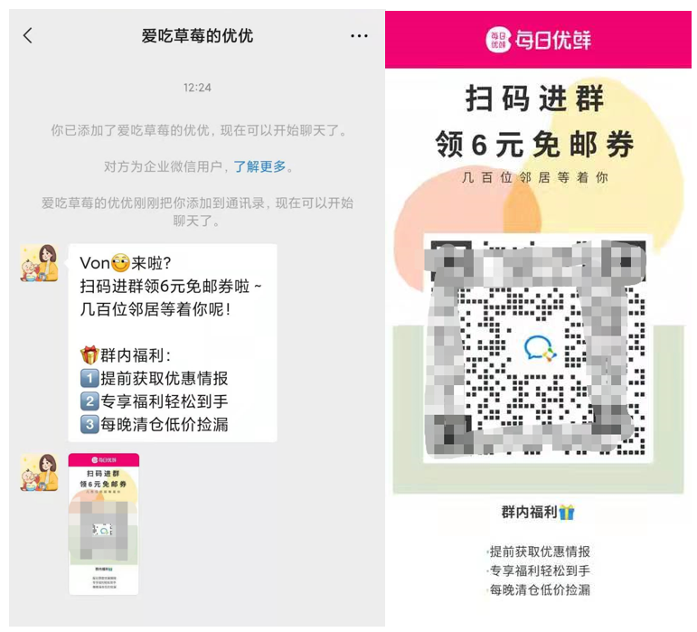 当然,重点还是引导用户扫码添加每日优鲜的官方企微号,然后先把用户沉淀到企微私域流量池里去。