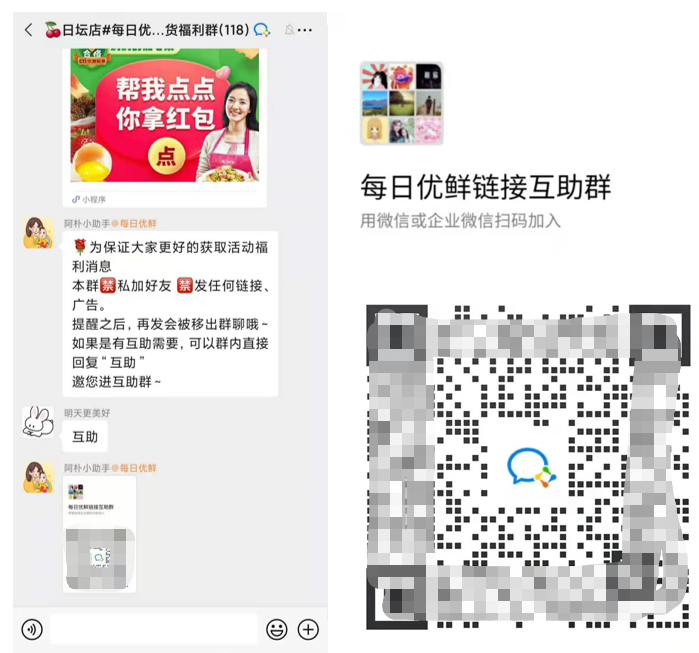 除了专门发布各种优惠促销信息的福利群之外,每日优鲜甚至还专门为有助力需求的用户建了互助群。
