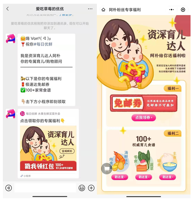 之前的大多数官方企业微信,基本都是以「福利官」、「小助手」这样的形象而出现,但每日优鲜的设定直接是「资深育儿达人·宝妈阿朴」。