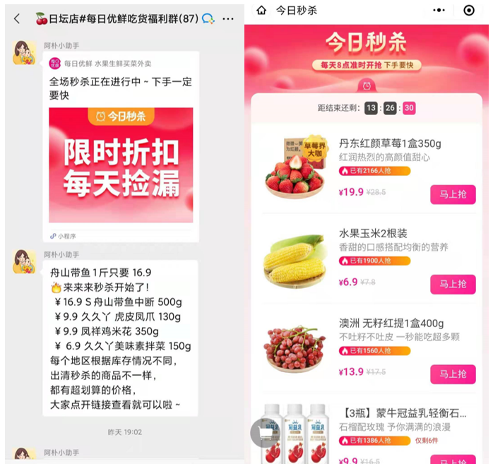 对于生鲜需求频率比较高的用户来说,这也是一个很好的福利,前面提到的每日优鲜互助群,就是帮助用户领到这些小额券,促进他们的消费。