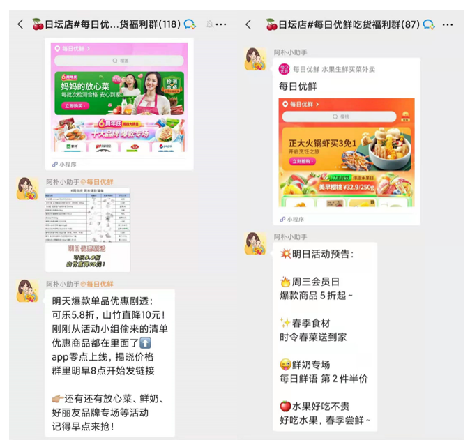 第5点,每日优鲜还在社群里多做了一步,就是每天会像电视剧一样,在群里发布明天的优惠活动预告。