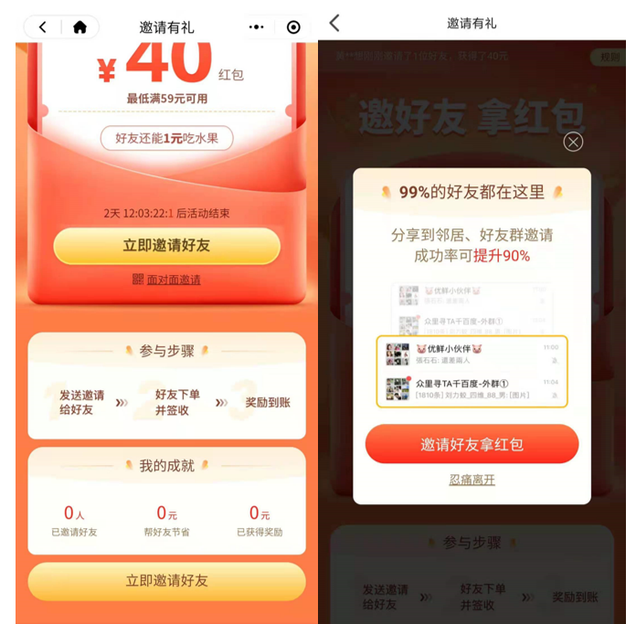第1种,邀请1位好友下单之后才能领取大额优惠券,福利高,门槛相对也高,但可以更有效地增加用户付费转化效果。