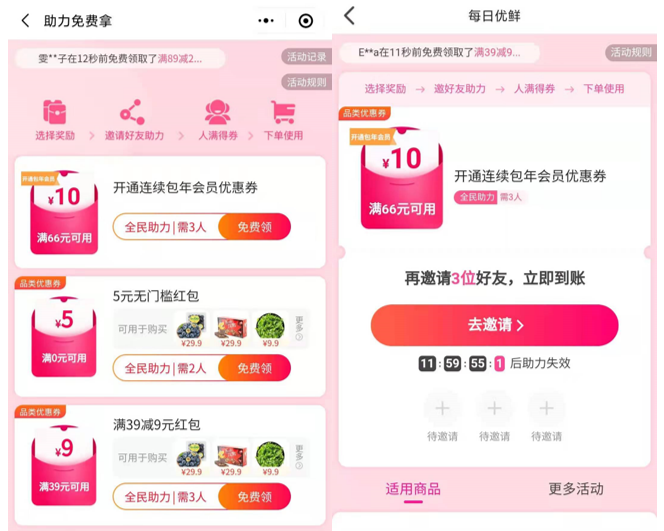 第2种,邀请不同人数的好友助力,就能获得对应的小额优惠券,这类活动几乎每天都有,而且门槛也低好多。