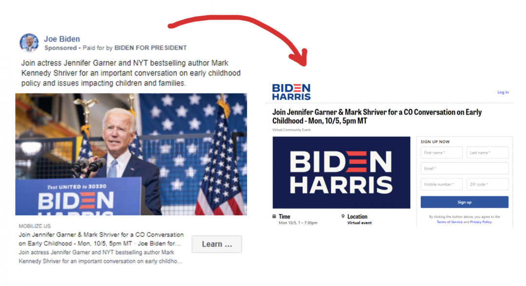 #p#分页标题#e#而拜登的这则facebook广告更贴合趋势,以邀请明星、畅销书作家共同做“在线直播”为钩子,无缝地连接到活动报名页上。活动页除了主题词的重复,还写着硕大的拜登“个人品牌”词,并在文案的地方清晰注明是“任何人都可以报名”的在线活动,表达清晰干练。