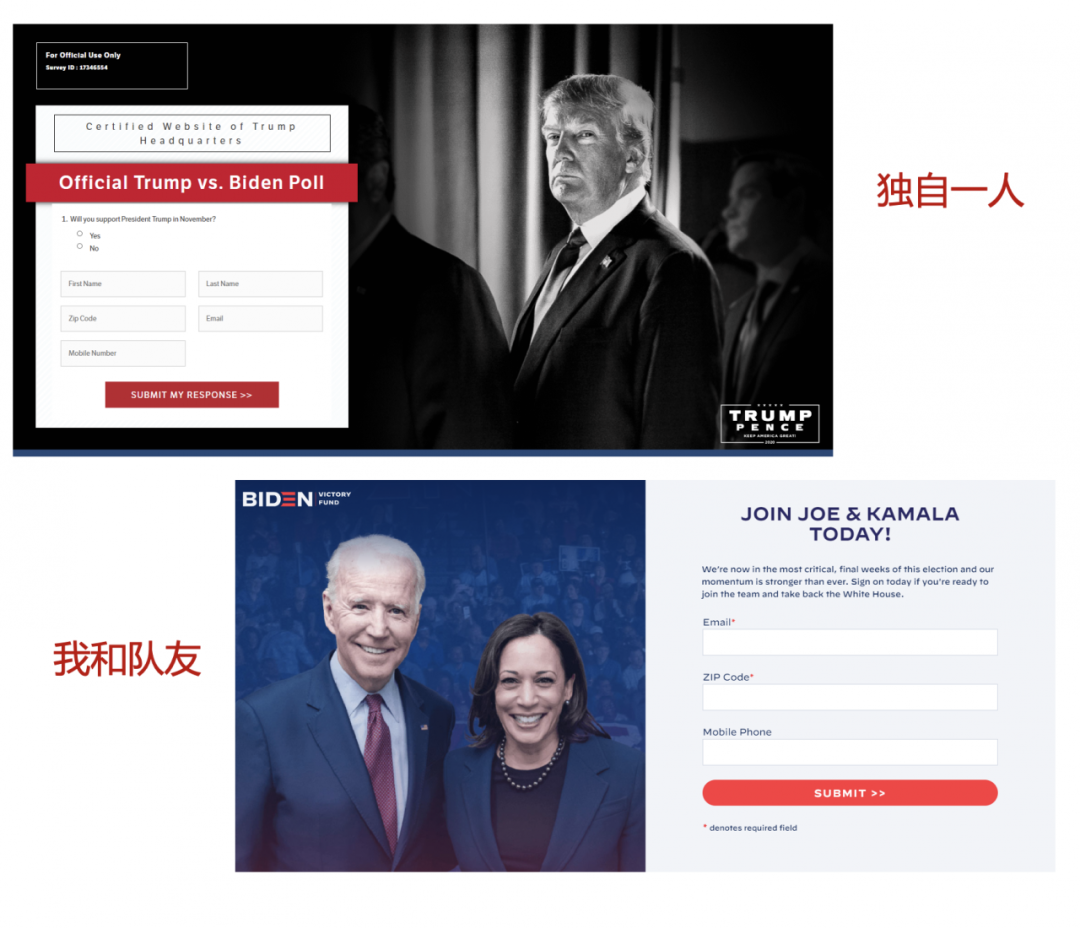 落地页的主图选择决定了页面的基调,双方的页面都选择了一个相对干净、深色的背景,这和竞选的隆重基调相符;且因为是个人品牌的曝光,主图都配以突出、高清的人物肖像,通过细节的表情、眼神,来打动观众。